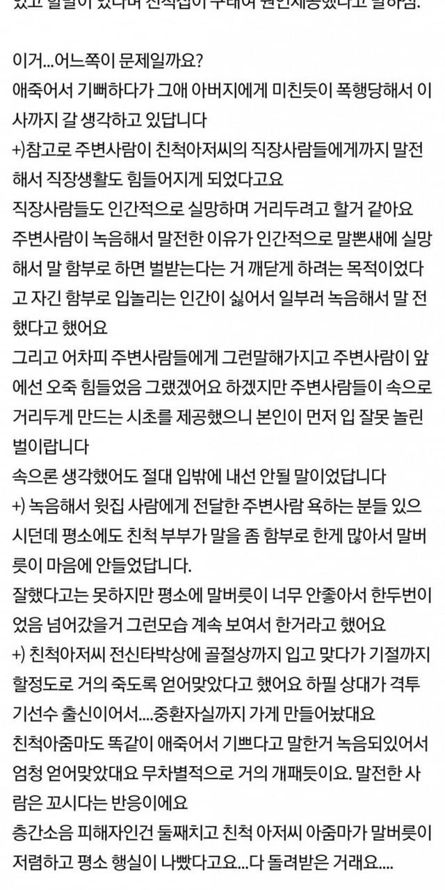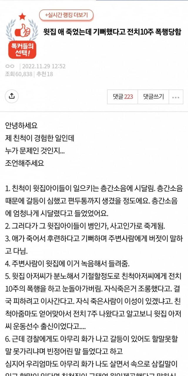 윗집 애 죽었는데 기뻐했다고 전치10주 폭행당함