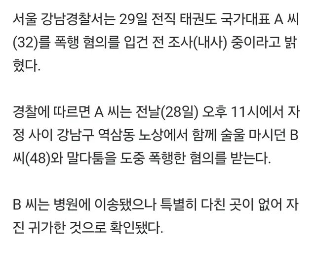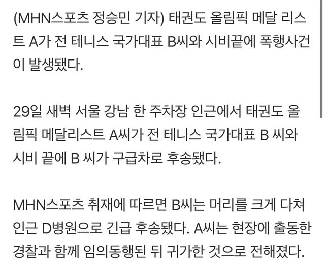 처음 나온 기사: 테니스가 태권도한테 폭행당해서 머리를 크게 다쳤다