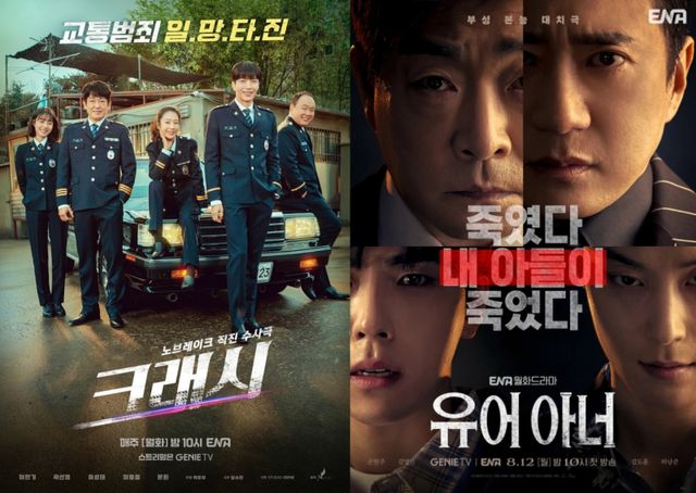 ENA는 월화드라마에 집중했다. 특히 ENA는 올해 개성 뚜렷한 작품들을 선보였는데, 도로 위 범죄를 조사하는 경찰들의 이야기를 다룬 ‘크래시’, 아들의 살인을 감추려는 판사와 아들의 죽음을 밝히려는 권력자의 부성애 대결을 그린 ‘유어 아너’가 호평을 얻었다. 두 작품은 각각 최고 시청률 6.6%, 6.1%를 기록, 채널 인지도가 높지 않음에도 좋은 성과를 냈다는 평가를 끌어냈다.