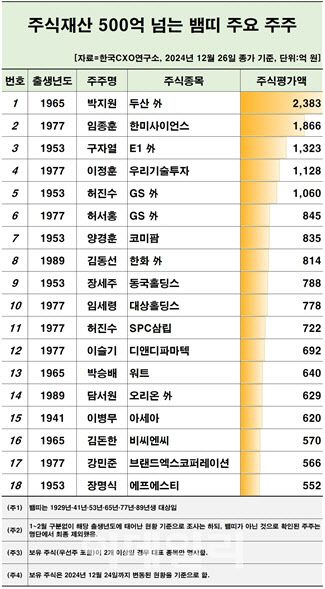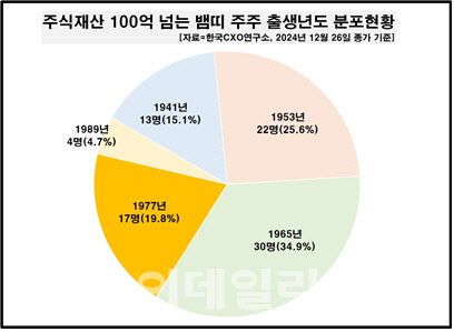아울러 지난 26일 기준 주식평가액이 100억 원 넘는 뱀띠 주주는 86명으로 집계됐다. 이들을 출생연도별로 살펴보면 1965년생이 30명(34.9%)으로 가장 많았다. 이어 1953년생(22명, 25.6%), 1977년생(17명, 19.8%), 1941년생(13명, 15.1%) 순으로 많았다. 1989년생도 4명 있었다.