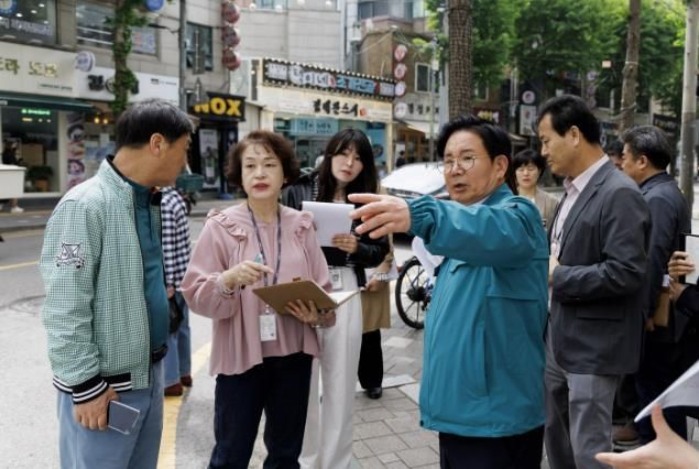 | ▲ 박강수 마포구청장과 관계 공무원들이 도로시설물 현장 확인을 하고 있다. |