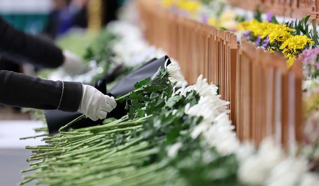 30일 오후 전남 무안군 무안종합스포츠파크에 마련된 제주항공 여객기 사고 희생자 합동분향소에서 조문객들이 헌화하고 있다. / 뉴스1