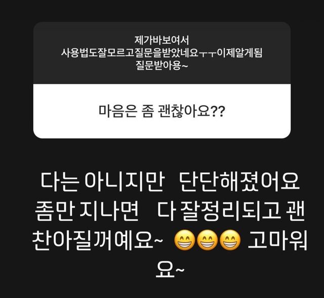 그는 '무엇이든 물어보세요'를 통해 '마음은 괜찮냐'고 묻는 팬에게 "다는 아니지만 단단해졌어요. 좀만 지나면 다 잘 정리되고 괜찮아질 거예요. 고마워요"라고 답했다.
