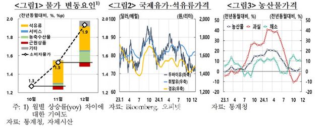 석유류 가격 상승률은 11월 -5.3%에서 12월 1.0%로 상승 전환했고, 농축수산물가격은 1.0%에서 2.6%로 상승률이 확대됐다. 전체 소비자물가 상승률 증가에 대한 기여도를 보면 석유류가 0.26%포인트, 농축수산물이 0.12%포인트 씩을 올렸다.
