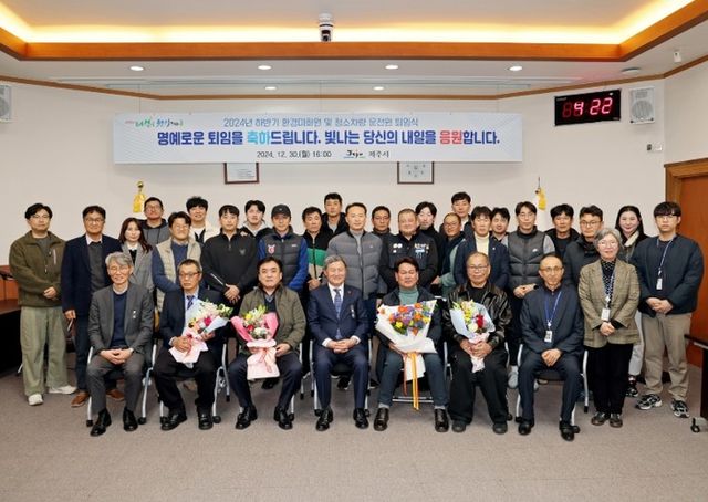 이번 퇴임식에서는 그동안 제주시의 청결하고 쾌적한 환경을 책임진다는 보람과 사명을 갖고 헌신한 환경미화원 및 청소차량 운전원 5명에게 제주특별자치도지사 표창이 수여됐다.