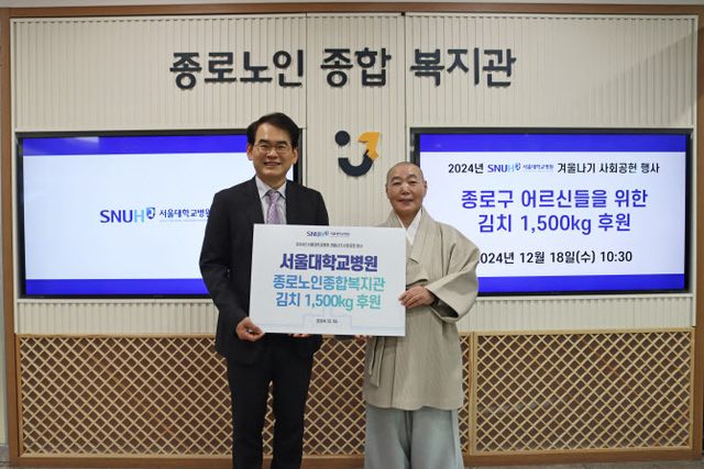 서울대병원은 지난 18일, 종로구 이화동 ‘종로노인종합복지관’을 찾아 독거 어르신을 위한 김장김치 1,500kg를 후원했다. 이어 낙원동 ‘원각사 노인무료급식소’를 방문해 식사환경 개선을 위한 급식시설비용 900만원을 지원했다.