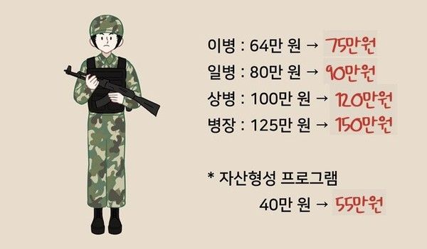 병 봉급의 경우 ▲이병은 64만원에서 75만원 ▲일병은 80만원에서 90만원 ▲상병은 100만원에서 120만원 ▲병장은 125만원에서 150만원으로 오른다. 장병내일준비적금도 월 40만원에서 55만원으로 오르면서 병장은 월 최대 205만원을 받게 된다.