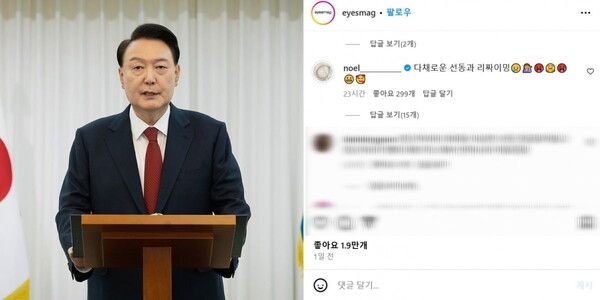 이날 한 사회관계망서비스(SNS) 매거진 계정에서 윤 대통령에 대한 체포영장이 발부됐다는 게시물이 올라오자, 노엘은 "진짜 역겹다"며 "페이지 닫아라"는 비난의 댓글을 남겼다.