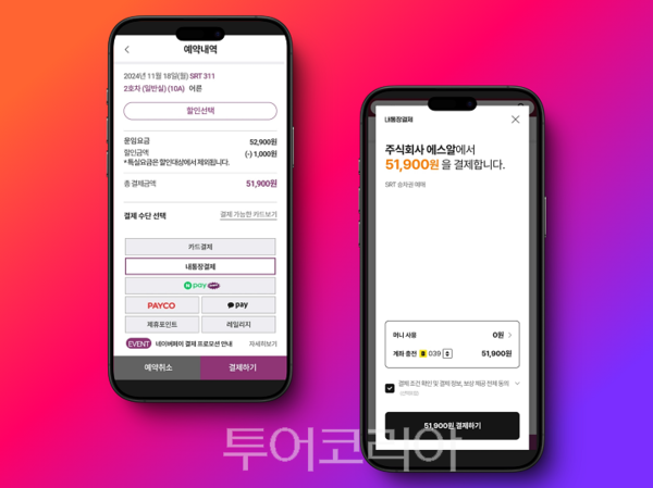 [투어코리아=조성란 기자] 에스알(SR)은 오늘(31일_부터 SRT앱과 홈페이지에서 승차권 구입 시 ㈜헥토파이낸셜의 ‘내통장결제’를 추가해 간편결제 서비스를 확대, 고객 편의 향상에 나선다.