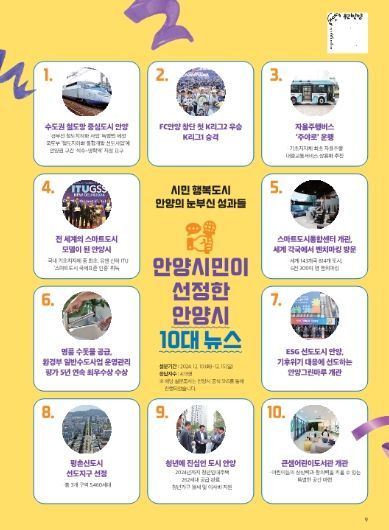 올해 안양시에 있었던 10가지 주요 소식으로는 ▲수도권 철도망 중심도시 안양 ▲FC안양 K리그1 승격 ▲자율주행버스 ‘주야로’ 운행 ▲유엔 산하 ITU 스마트도시 국제표준 인증 ▲스마트도시통합센터 신축 개관 ▲환경부 일반수도사업 운영관리평가 5년 연속 최우수 등이다.