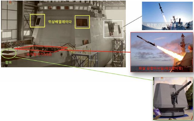 또 수직발사기(VLS)에는 지상을 공격할 수 있는 ‘화살’ 순항미사일과 KN-06 개량형 함대공 미사일 등을 탑재해 발사가 가능할 것으로 평가됐다. 북한판 ‘우란’으로 추정되는 함대함 미사일도 탑재할 것으로 보인다.