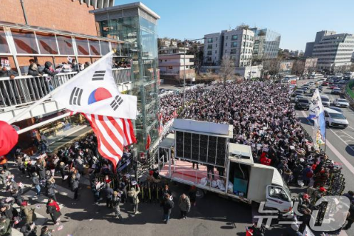 언론의 생중계 영상에 따르면, 오전 11시 12분경 경찰은 탄핵 반대 시위자들 앞에 일렬로 배치됐으며, 2분 뒤에는 경찰 버스가 도로로 진입했다. 이에 윤 대통령 지지자들로 추정되는 일부가 버스를 가로막았고, 일부는 도로에 드러누워 경찰의 진입을 저지하려 했다. 이들은 대치 상황을 이어가며 현장은 한때 아수라장으로 변했다. 특히, 노란 점퍼를 입은 백발의 남성이 울분을 토하며 바닥에 고꾸라지려 했고, 경찰관 4명이 그를 붙잡는 장면도 포착됐다.