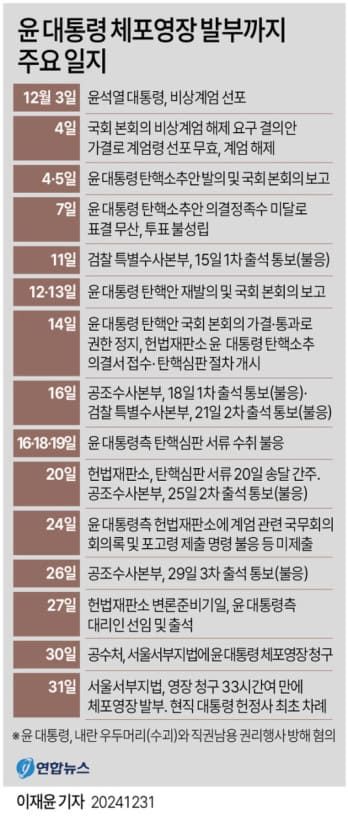 [속보] '헌정 사상 최초' 법원, 내란 혐의 尹 대통령 체포 영장 발부