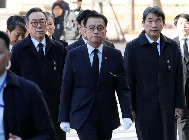 최상목 대통령 권한대행 부총리 겸 기획재정부 장관을 비롯한 국무위원들이 31일 오전 서울시청 본관 앞에 마련된 제주항공 여객기 희생자 합동분향소를 찾아 헌화하기 위해 이동하고 있다. / 뉴스1