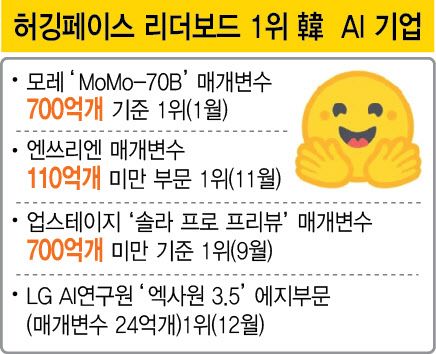 이런 가운데, LG AI연구원, 모레, 업스테이지, 엔쓰리엔 등이 세계 최대의 AI 플랫폼인 허깅페이스의 ‘오픈 LLM 리더보드’에서 1위를 차지해 2025년 이들의 활동에 관심이 집중되고 있다. 허깅페이스 오픈 LLM 리더보드는 개방형 AI 모델의 성능을 측정해 순위를 매기는 웹사이트다.