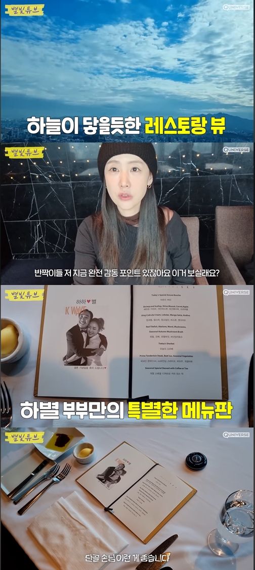 이후 63빌딩 레스토랑에 도착한 별과 하하는 통창 유리로 보이는 서울 시티뷰에 감탄했다. 그리고 별은 "저 지금 완전 감동 포인트다. 이런 걸 준비해주셨다"라며 메뉴판을 비췄다.