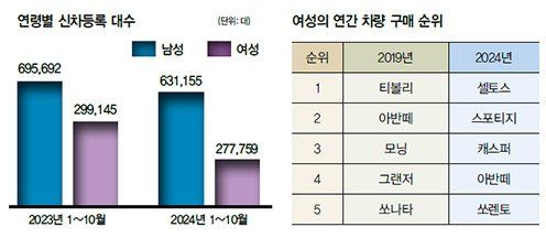 이러한 차이는 선호 차급에서 나오는 것으로 보인다. 남성은 쏘렌토·싼타페·카니발 등 패밀리카로 분류되는 중형급 이상 SUV 구매가 많다. 여성은 경차·소형·준중형 등 상대적으로 덩치가 작은 ‘가성비’ 차량을 구매하는 비중이 높다.