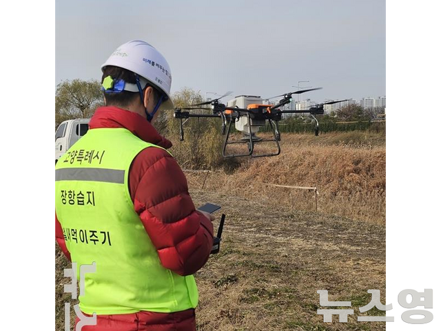고양시는 장항습지를 찾는 철새에게 드론을 이용해 먹이를 주기 시작한 것은 2년여 전부터이다. 드론 살포가 조류 독감에도 효과적이라는 전문가들의 말을 반영해 지난해 시범적으로 실시하고, 올해부터 전면적으로 실시하게 됐다. 과거 트랙터나 사람이 직접 먹이를 줄 때 보다 친환경적이라는 평이다.