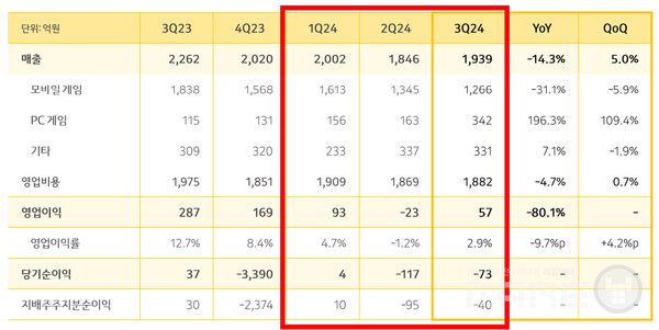 작년 카카오게임즈의 실적을 보면 분기당 약 2000억 원의 매출을 올렸다. 이대로라면 2024년 약 8000억 원의 매출을 기록할 전망이다. 증권가에서 예상중인 카카오게임즈의 2024년 실적은 7757억 원이다. 2021년 1조 125억원, 2022년 1조 1477억 원, 2023년 1조 251억 원에서 1조원 밑으로 하락한 모습이다.