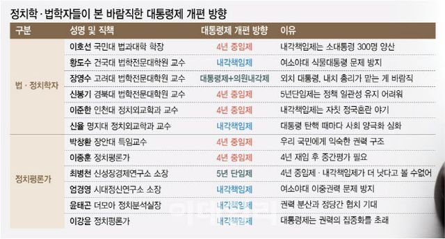 장영수 고려대 법학전문대학원 교수는 대통령제와 내각책임제를 반씩 섞는 방식을 제안했다. 그는 “대통령은 외교·국방처럼 지속·안정성이 필요한 분야를 한정해 맡고, 의회와 협력이 필요한 부분은 총리가 담당하면 된다”고 말했다.