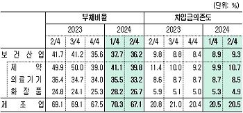 보건산업 제조업체의 부채비율(37.7 → 36.2%)과 차입금의존도(8.9 → 9.3%)는 직전분기(2024년 1/4분기)와 유사한 수준을 유지하며, 안정적인 재무 상태를 보였다.
