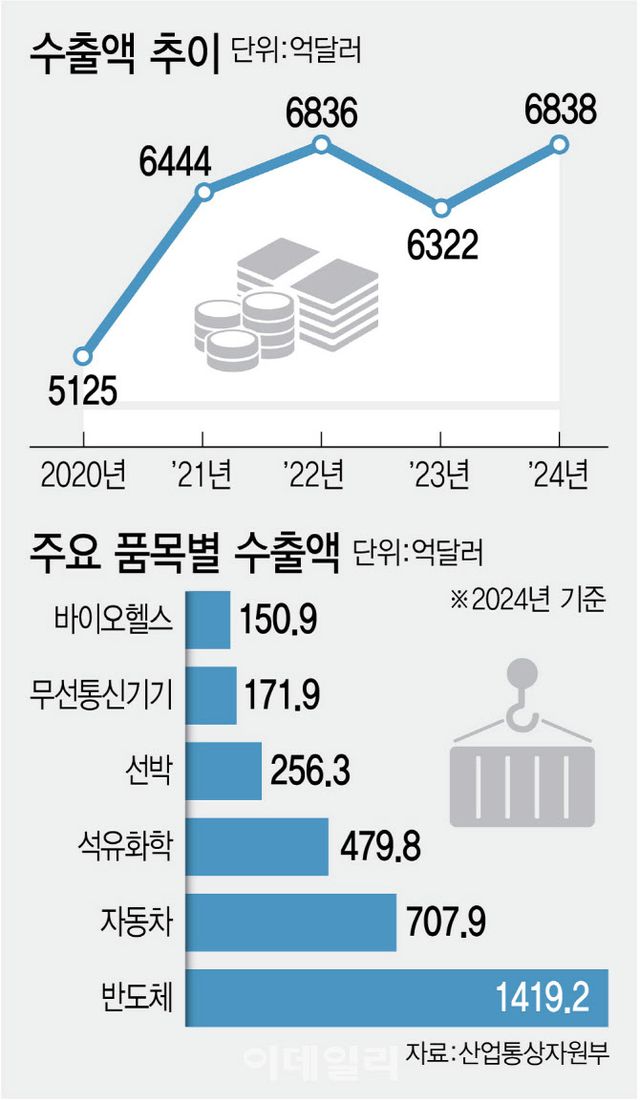 1일 산업통상자원부와 관세청에 따르면 우리나라는 2024년 한해 총 6838억달러(약 1006조원·통관기준 잠정)를 수출했다. 전년대비 8.2% 늘어난 역대 최대치다. 기존 역대최대 실적은 2022년의 6836억달러였다.