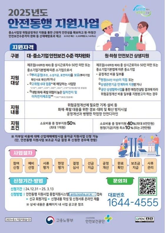 고용노동부와 한국산업안전보건공단은 31일 중소사업장의 중대재해 등 산업재해 예방을 위한 ‘2025년 클린사업장 조성지원 사업’ 지원신청 접수를 시작한다고 밝혔다.