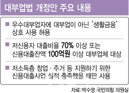 1일 국회 의안정보시스템에 따르면 박수영 국민의힘 의원은 우수대부업자에 ‘생활금융’ 상호를 허용하는 내용의 대부업법 개정안을 지난해 12월 27일 대표 발의했다. 개정안에 따르면 금융위원회는 저소득층 창업·주거 등을 지원하기 위한 신용대출사업 실적 등을 충족하는 대부업자를 ‘생활금융 우수대부업자’로 지정할 수 있고 명단을 고시해야 한다. 구체적인 우수대부업자 요건은 대통령령에서 정하도록 했다. 현재 금융당국은 저신용자 대출비중이 70% 이상이거나 저신용자 신용대출잔액이 100억원 이상인 등록 대부업체를 우수업체로 선정하고 있다.