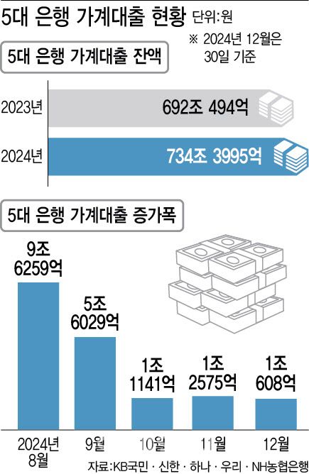 1일 금융권에 따르면 5대 은행(KB국민·신한·하나·우리·NH농협)의 지난해 12월 30일 기준 가계대출 잔액은 734조 3995억원을 기록했다. 2023년 말(692조 494억원)보다 41조 9901억원, 11월 말(733조 3387억원)보다는 1조 608억원 늘었다.