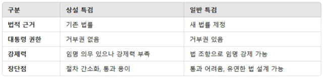 여기까지는 차이가 없어 보이지만, 앞서 이야기했던 것처럼 대통령의 재의 요구권(법률안 거부권)에서 차이가 발생합니다. 상설 특검은 원칙적으로 새로운 법률 제정이 아니기 때문에 대통령의 고유 권한인 법률안 거부권을 사용할 수 없지만, 일반 특검은 법을 새로 만드는 행위이기 때문에 거부권을 사용할 수 있죠.