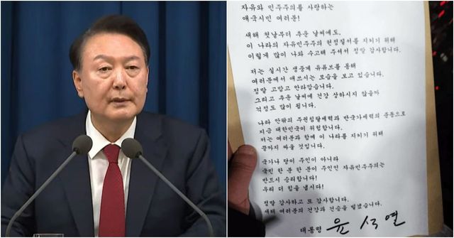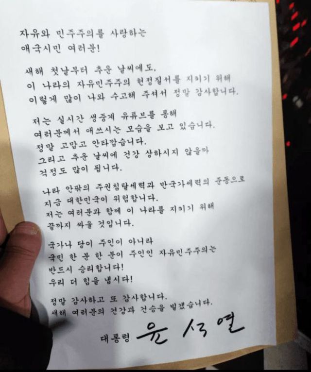 1일 윤 대통령 탄핵심판 대리인과 수사 변호인단을 돕는 석동현 변호사는 “이날 저녁 7시 반경 윤 대통령이 이틀째 관저앞 도로변에서 24시간 철야 지지집회중인 시민들에게 A4용지에 직접 서명한 새해 인사 및 지지감사 인사글을 관계직원 통해 집회현장 진행자에게 원본 1부를 전달했다”고 밝혔다.