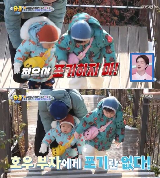 호기롭게 시작한 은우는 초반부터 끝도 없는 계단에 당황하는 모습을 보였다. 그러나 김준호는 “정우도 걸어가 보자”라며 안고 있던 정우까지 내려 본격 등산에 나섰다. 동생을 본 은우는 “정우 할 수 있어. 형처럼 해 봐”라며 의젓하게 동생을 응원했고, 정우는 김준호의 도움을 받아 계단을 올랐다.