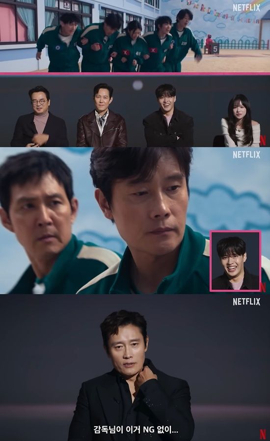 영상에는 넷플릭스 시리즈 '오징어 게임2'의 주연 배우들이 하이라이트 영상을 함께 보는 리액션이 담겼다. 이들은 극 중 5인6각 경기를 함께하는 바. 각자 맡은 게임과 관련한 비하인드를 들려줬다.