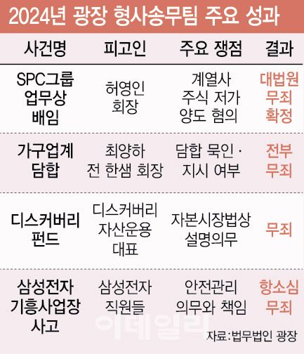 가장 주목할 만한 성과는 허영인 SPC그룹 회장의 업무상 배임 사건이다. 계열사 주식을 현저히 저가에 양도했다는 혐의로 기소된 이 사건에서 광장은 1·2심을 거쳐 대법원에 이르기까지 일관되게 무죄 판결을 이끌어냈다. 계열사 간 비상장주식 거래의 특수성을 면밀히 분석해 배임행위가 성립되지 않고 배임의 고의도 없었다는 점을 입증해낸 것이다.