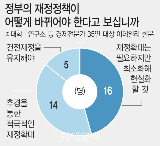 1일 이데일리가 경제전문가 35명을 대상으로 실시한 ‘2025년 경제 전망’ 설문 결과에 따르면 응답자의 85.7%(30명)가 추경 등 재정확대가 필요하다고 봤다. ‘건전재정을 유지해야 한다’는 응답은 14.3%(5명)에 불과했다.