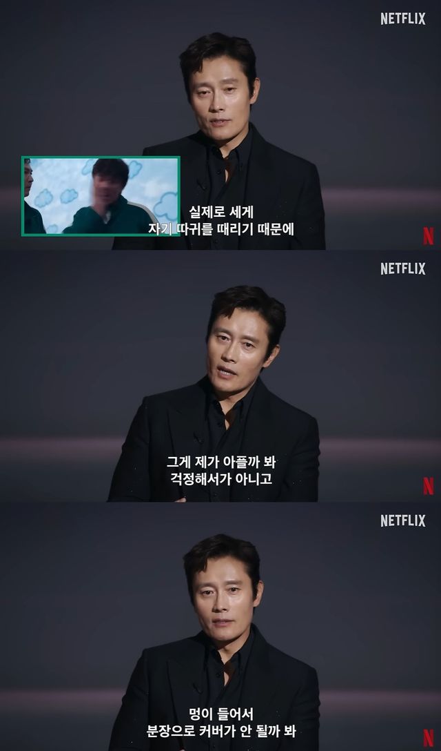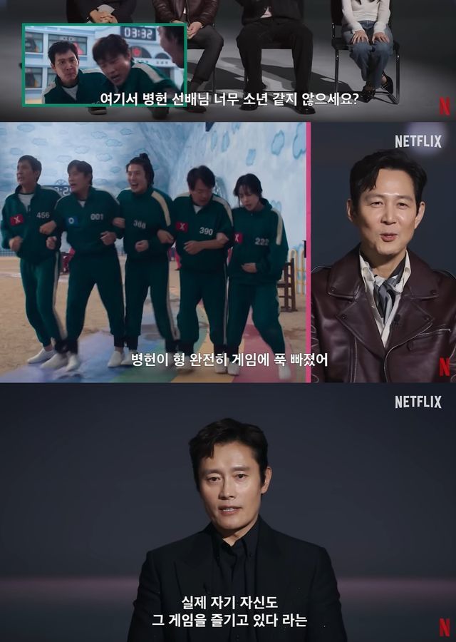 이어 극 중 게임에 성공해 다음 챕터로 넘어가 기뻐하는 이병헌의 모습이 카메라에 잡히자 강하늘은 "병헌 선배 너무 소년같지 않냐"고 짚었고 이정재는 "병헌이 형 게임에 푹 빠졌다"라고 미소지었다.