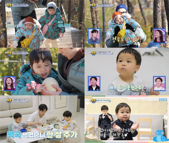 이어 김준호, 은우, 정우 삼부자는 새해를 맞아 만두 빚기에 도전했다. 정우는 만두의 속 재료가 등장하자, 냅다 “밥!”이라고 외치며 ‘식탁 언어’에 시동을 걸었고, 속 재료를 한 입 먹더니, “두부다! 또 줘”라며 언어력을 상승시켰다. 은우는 보조 셰프로 나서 만두피에 물을 바르고, 재료를 넣으며 섬세한 손길을 자랑했다. 이때 은우는 공룡이 태어났다는 소식에 설렘을 안고 달려갔지만, 예상치 못한 장난감 공룡의 무시무시한 비주얼에 “무서워. 문 닫아”라며 도망가 보는 이들을 폭소케 했다. 평소 거침없는 성격을 보여준 정우마저 공룡의 주변을 돌기만 하며 아빠 껌딱지가 됐다. 이후 ‘우형제’는 직접 만든 만두를 맛봤고, 정우는 “잘라줘!”라고 명확히 말하며 19개월에 먹분야 언어 천재의 면모를 보였다. 이에 5살이 돼 더욱 씩씩해진 은우, 3살이 돼 먹언어가 트인 정우까지 업그레이드된 ‘우형제’의 앞날을 기대하게 했다.