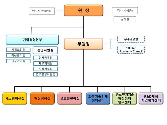 STEPI는 기존 4본부, 4센터, 6연구단, 1실의 구조를 변경하여 1본부, 3센터, 4실로 개편했다.