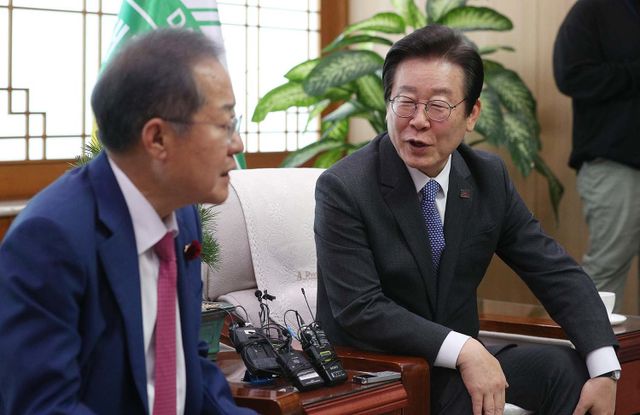 이재명 더불어민주당 대표가 20234년 5월 10일 오후 대구시청 산격청사 접견실에서 홍준표 대구시장과 환담을 나누고 있다. / 뉴스1