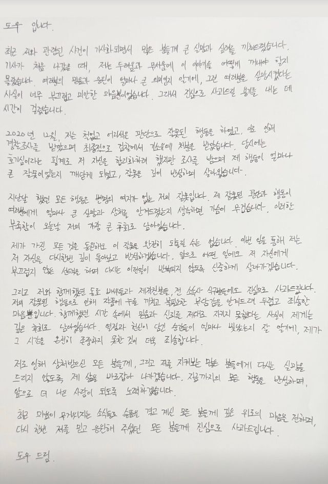 지난달 31일 한도우는 자신의 인스타그램 스토리에 "최근 저와 관련된 사건이 기사화되면서 많은 분께 큰 실망과 심려를 끼쳐드렸다"라며 "기사가 처음 나갔을 때, 저는 두려움과 무서움에 이 이야기를 어떻게 꺼내야 할지 몰랐고, 여러분의 믿음과 응원이 얼마나 큰 의미인지 알기에, 그런 여러분을 실망시켰다는 사실이 너무 부끄럽고 미안한 마음뿐이었다. 그래서 용기를 내는 데 시간이 걸렸다"라며 운을 뗐다.