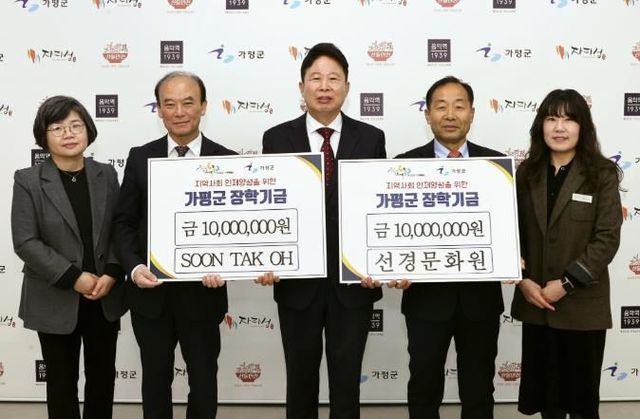 가평군은 최근 선경문화원과 오순탁 선경문화원 세계화본부장이 지난해에 이어 각각 1,000만원씩 모두 2,000만원을 장학금으로 기탁했다고 밝혔다.