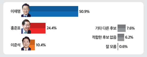 한국일보 여론조사(한국리서치에 의뢰, 지난해 12월 22∼23일 실시, 만 18살 이상 1000명 대상, 휴대전화 가상번호 면접 100%, 표본오차는 95% 신뢰수준에 ±3.1%포인트, 응답률 14.8%)에서도 이 대표는 38%로 압도적 1위를 기록했다.
