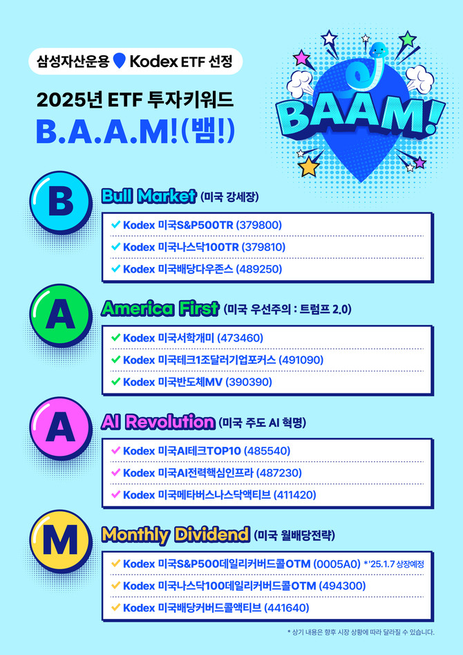 한편, 삼성자산운용은 올해 담아가야할 ETF 포트폴리오를 고민하고 있는 투자자들을 위해 '2025년 투자키워드 B.A.A.M'을 주제로 오는 9일 저녁 7시에 유튜브 라이브 웹세미나를 진행할 예정이다. 추첨을 통해 △신라호텔 파크뷰 식사권(2인) 2명 △BBQ 황금올리브치킨 및 콜라 1.25L 세트 50명 등 다양한 경품도 함께 제공한다.