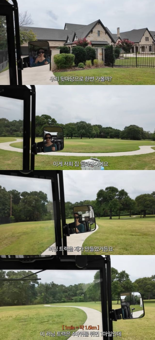 뒷마당에는 넓은 정원이 펼쳐져 있어 마치 공원을 연상케해 눈길을 끌었다. 하원미는 "이게 저희 집 뒷마당이다. 러닝 트랙을 제가 만들었다. 이 러닝 트랙은 4바퀴를 뛰면 1마일이다. 집에서 뛰고 싶을 때 밖으로 안 나가고 (안에서) 뛰려 만들었는데 잘 뛰진 않는다"고 웃음을 터뜨렸다.