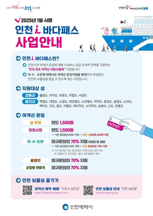 [투어코리아=유경훈 기자] 인천시가 인천시민의 이동권을 보장하고, 섬 관광 활성화를 위해 ‘인천 아이(i) 바다패스’ 사업을 2일부터 본격 시행에 들어갔다.