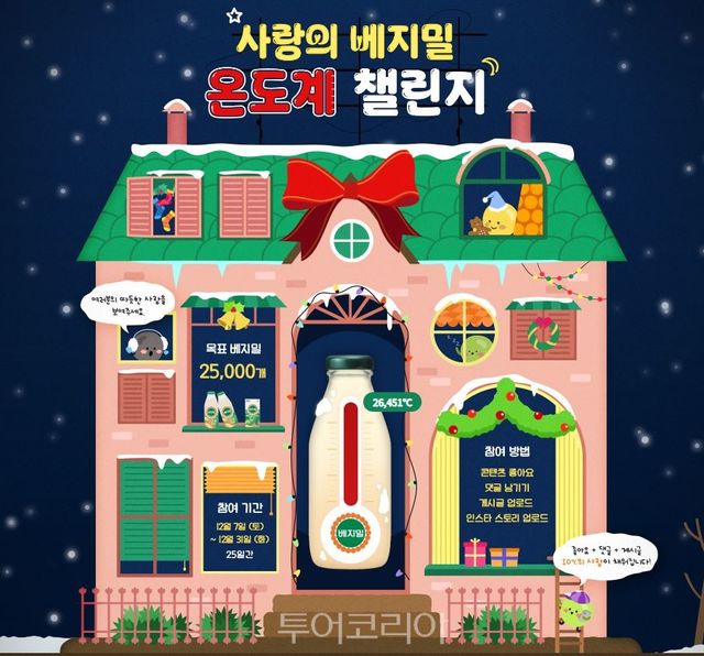 지난 12월 7일부터 31일까지 총 25일간 진행된 이번 캠페인은 목표치인 25,000℃ 달성에 성공했다. 이에 따라 정식품은 사회복지법인 대한사회복지회를 통해 총 2만 5천개의 베지밀 두유를 아동시설, 노인복지관, 장애인복지시설 등 도움이 필요한 곳에 전달할 예정이다.