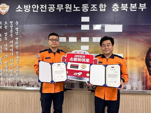 타이어뱅크㈜는 2일 한국노총 소속 전국소방안전공무원 노동조합과 함께 선정하는 소방히어로 31호·32호 주인공으로 충북 진천소방서 김재봉 소방위와 청주 동부소방서 정용혁 소방교를 선정하고 감사장과 타이어 교환권을 전달했다.