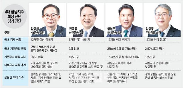 2일 이데일리가 4대 금융지주(KB국민·신한·하나·우리) 회장에게 설문 조사한 결과 회장들은 ‘생성형AI 활용’과 ‘임베디드 금융’ 등을 올해 주요 경영 키워드로 꼽았다. 양종희 KB금융 회장은 “올 4월 그룹 공동 생성형AI 플랫폼을 출시할 예정이다. 모든 계열사에서 자유롭게 생성형AI 모델을 활용해 계열사별 업무·상품·서비스에 AI를 적용할 환경을 마련한다”며 “AI 윤리위원회, 위험관리정책·메뉴얼 등 AI 거버넌스 체계 또한 은행을 시작으로 모든 계열사에 구축하겠다”고 말했다. 이어 “타 업종, 빅테크, 플랫폼 기업은 더는 우리 경쟁자가 아니라 새로운 길을 함께 만들어가는 파트너다”며 “임베디드 금융을 통해 우리 상품·서비스를 제공하고 제휴사로부터 새로운 고객을 확보해 함께 살아가고 성장하는 공동의 생태계를 조성해야 한다”고 강조했다.