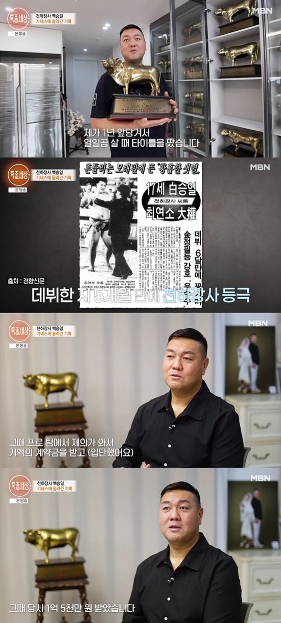 백승일의 집에는 황금빛 소 트로피(1등)가 셀 수도 없이 많았다. 백승일은 제일 묵직한 트로피를 꺼내들며 "17살에 소년 천하장사 때 탔던 트로피다. 강호동 선배님이 18살 때 천하장사가 되셨는데 제가 1년 앞당겨서 17살에 (천하장사) 타이틀을 땄다"고 이야기했다.
