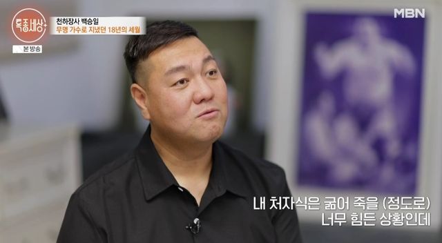백승일은 "음악 생활한다고 투자도 많이 했었는데 그걸 다 까먹었다. 한 달 동안 찜질방에서 잔 기억도 있다. 안 되는데도 포기를 못 하겠더라. 그동안 걸어온 길이 너무 아까웠다"고 털어놨다.